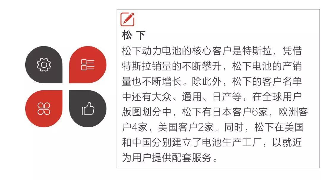 当下,松下已开发出镍钴锰酸锂、镍钴铝酸锂等锂电池,并已为企业配套。在产品开发中,为了解决镍氧化物带来的热稳定性低和安全方面的问题,松下在正极材料表面进行了纳米涂层处理,特别注重通过“松下固溶液Panasonic Solid Solution(PSS)”等技术提高安全性。